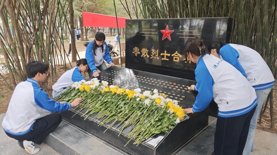 在向革命烈士敬献花篮的环节,学生们将花篮有条不紊地摆放整齐,接着手持鲜花,依次缓缓上前,把手中的鲜花轻柔地放置在纪念碑前,那一朵朵鲜花蕴含着全体师生对革命先烈的无尽哀思和深切缅怀。随后,全体师生满怀崇敬之情,为长眠于此的烈士们集体默哀。默哀结束后,全体师生向革命烈士三鞠躬,以最为质朴的方式表达对先烈的敬仰。