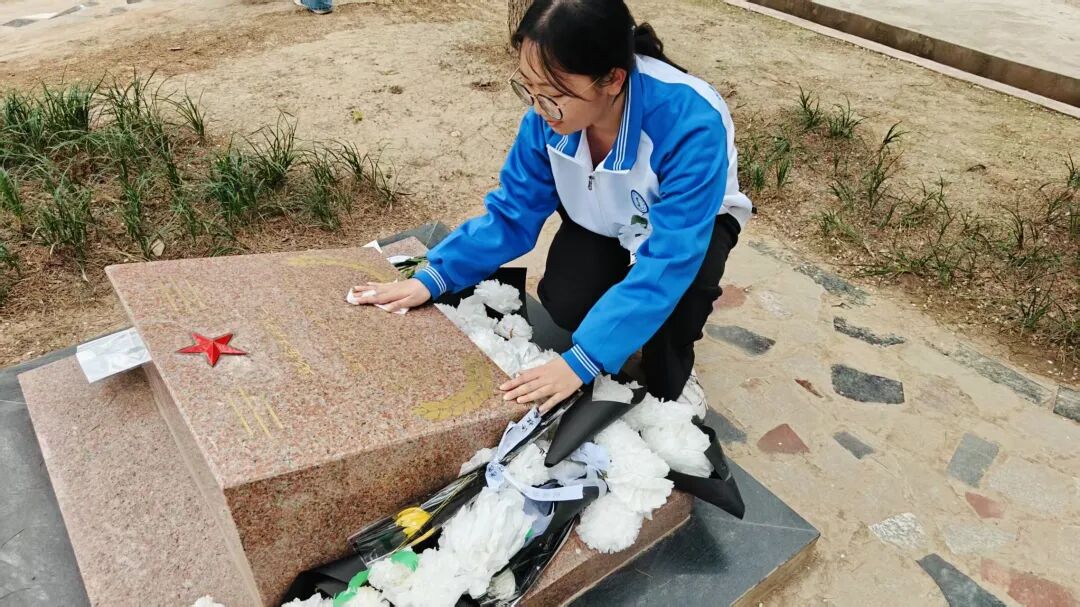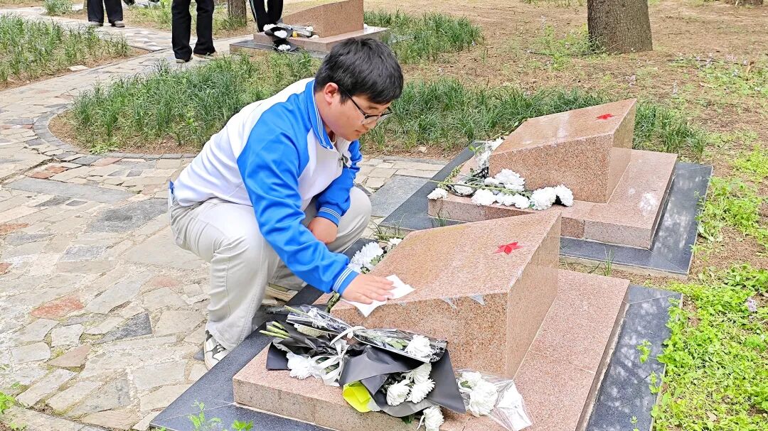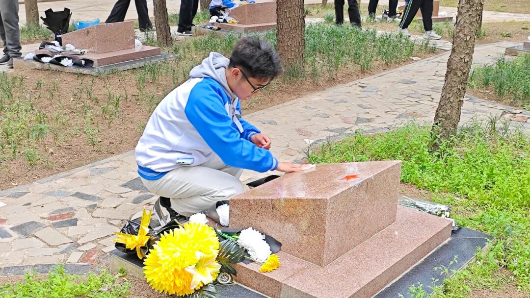 仪式结束后,学生们按照队伍顺序,有条不紊地前往陵园,为烈士擦拭墓碑以寄托哀思。